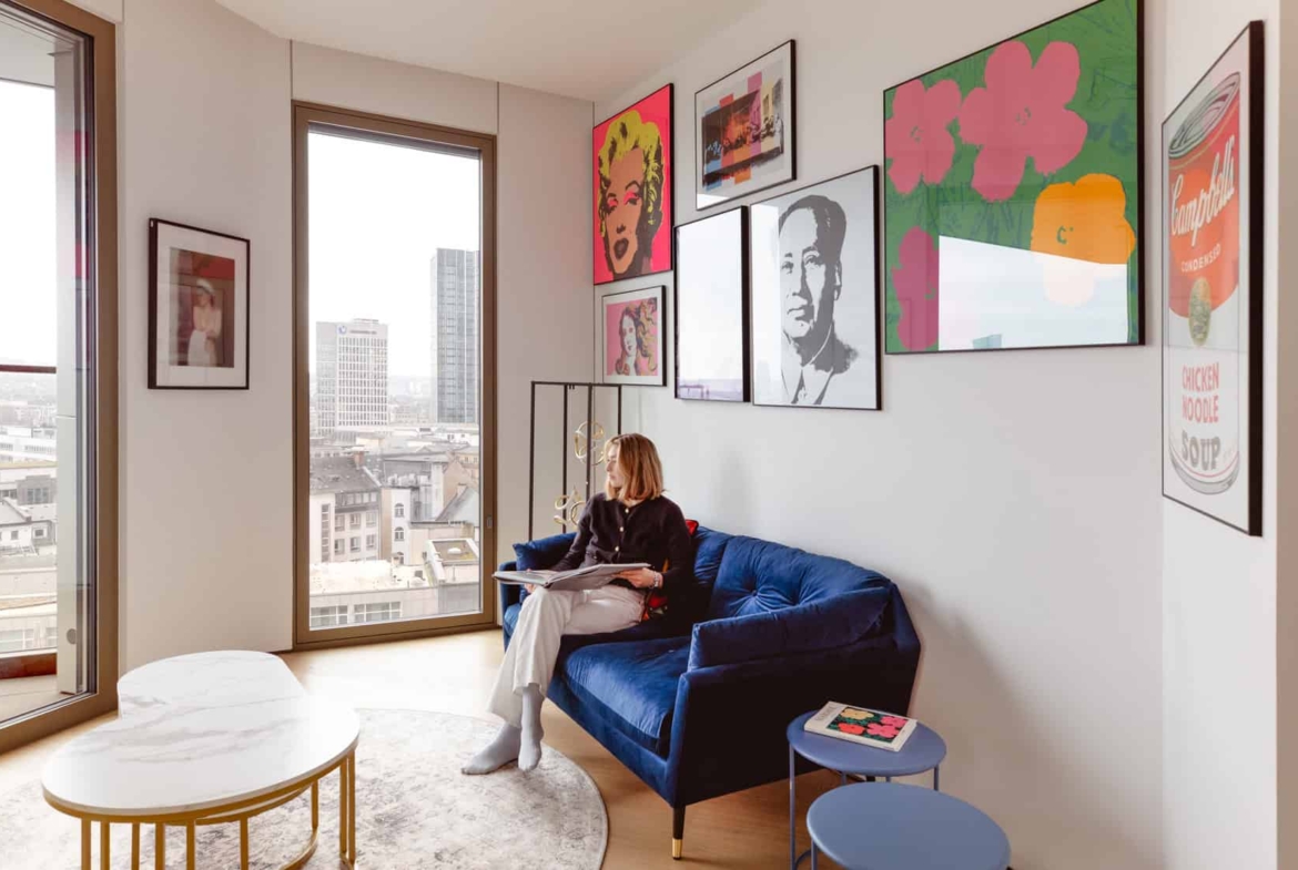 In this 60 square metre flat on the 10th floor of the FOUR building of the century, the furnishings are influenced by Pop Art and invite you to enjoy an unobstructed view of the city of Frankfurt.